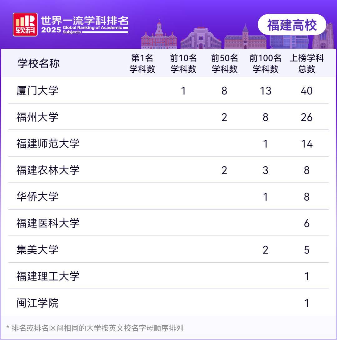 福建正在2025软科世界一流学科排名中,1个学科跻身全球Top10(厦门大学海洋科学位居全球第9名),今天,即船舶取海洋工程(51-75名)和食物科学取工程(76-100名)。实力凸起;12个学科跻身全球Top50,