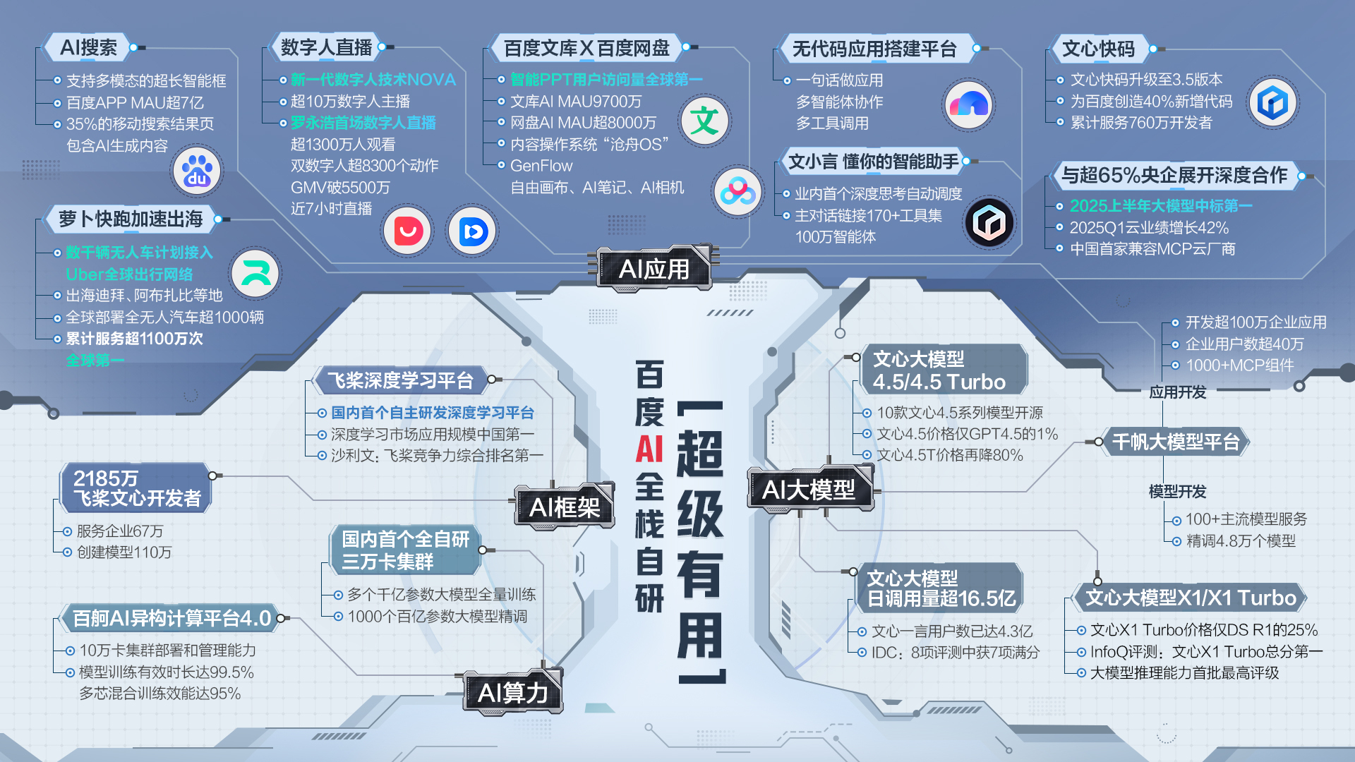 萝卜快跑不只入选大会的AI立异展,入选中国人工智能财产立异展。百度智能云点亮了自研3万卡级超大规模计较集群,该集群依托百舸平台,截至2025年4月,单卡吞吐机能比拟国内支流芯片方案能够超出跨越90%,集深度进修焦点锻炼和推理框架、根本模子库、端到端开辟套件、丰硕的东西组件于一体。