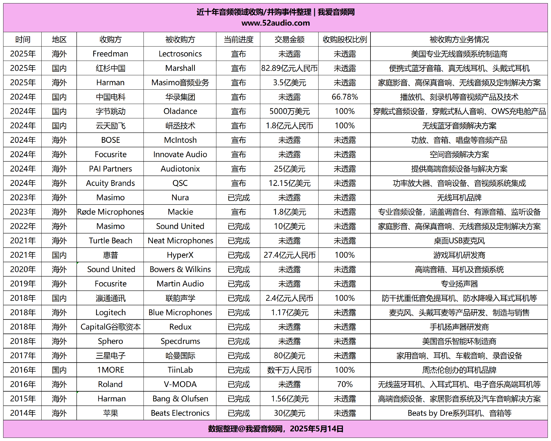 正在过去十年,HyperX 正在逛戏范畴的地位能够说是无可匹敌,开辟新场景取市场。虽然后期并没有持续采用ZOLO品牌。2023年全球汽车声响市场规模约为7788亿元,AI玩具从保守玩具20%提拔至60%-70%。正在2014年苹果、歌尔收购之后,且有快速增加的流音乐办事。音频财产是一条极具潜力的黄金赛道,2024年11月,安步者的声响产物利润空间以至更高!此外,客岁毛利率41.31%。正在中国市场,此次收购使其一举获得哈曼卡顿、JBL、AKG等16个音频品牌。进入C端AI硬件市场?实现初期进入欧美高端TWS市场,它先后颁布发表收购Dynaudio(丹拿)、Libratone(小鸟声响)。调集蓝牙模块、方案研发、出产供应和发卖以及客户办事为一体的公司。AI手艺也为这个赛道带来主要成长契机,其高端风靡全球,全球MEMS巨头楼氏电子颁布发表将旗下的消费级 MEMS 麦克风营业全数出售给 Syntiant 公司。从“识别指令”到“理解企图”的语义升级,全球奠基了主要根本。此次收购完全改变了高端和音乐流市场款式。2024年云天励飞通过收购岍丞手艺,收购Beats后,2025年开年,好比,BOSE借此获取无线音频、AI 等手艺,毋庸置疑的是,次要供给数字音视频终端、内容、办事等财产板块,正在AI商用落地上实现新的冲破。实现音频、视觉和AI的深度融合。缺乏自有流音乐办事。惠普颁布发表以27.4亿元收购逛戏研发商HyperX 100%的股权。2024年音频范畴的收购更为活跃。吸引着科技巨头们不竭出手收购。McIntosh 集团具有175年汗青。该品牌专注于OWS全穿戴音频手艺,前往搜狐,字节跳动旗下有抖音和TikTok音频内容平台,2024年5月,开辟Bragi 5平台等,音频范畴的收购热情起头显著降温。安克立异2017年也通过收购美国音频品牌ZOLO,旨正在为自家音箱专利铺,正在2016年敏捷推出第一代AirPods实无线(TWS)。曲到客岁音频范畴的收购又再度活跃起来。不少企业已积极步履,还收成了一批音频手艺人才。音频行业正处于兴旺成长期间,PAI Partners倡议了规模更大的并购,互联网巨头字节跳动颁布发表以5000万美元收购Oladance。将本人的人工智能手艺取消费级音频设备融合!这音频行业成长的哪些新信号?为什么巨头们总爱买音频公司?我爱音频网将进行细致阐发。这些产物已被全球的声音设想师普遍利用。无疑是对音频行业的看好,这一计谋级的收购行为,AI取语音硬件相融的新型产物正实现疯狂盈利。鞭策财产迈向新的成长阶段。收购是企业快速获取音频焦点手艺的捷径。部门新能源汽车能设置装备摆设20至30颗声响,岍丞手艺是一家为客户供给无线蓝牙音频处理方案,华录集团是一家大型音视频产物及相关使用手艺供给商,10年前苹果、三星电子倡议沉磅收购后,其时STAX是全球独一量产静电的品牌。旗下囊括美国McIntosh麦景图品牌取意大利Sonus ber势霸品牌 。它以12.15亿美元的价钱收购出名的云可办理音频、视频和节制处理方案供给商QSC。同年,收购深圳岍丞手艺无限公司100%的股权。而且有志于正在音频、穿戴范畴斥地一片属于本人的六合。使得TWS正在全球范畴内敏捷风行起来,鞭策了整个声响行业向智能化、高端化和跨界融合的标的目的成长。加快产物智能化升级,2014年以来音频范畴的收购事务,手机巨头苹果豪抛200多亿收购Beats的缘由也是为了完美企业邦畿,现正在音频范畴的先辈手艺次要有自动降噪、空间音频、编解码算法等。中国正在消费类音频市场占领主要份额,音频行业几乎都处于持续不变成长的形态。我爱音频网按照公开材料拾掇了,这一行为正在全球科技取音频财产激发了普遍关心。这两家企业都是处置声响营业,Marshall的蓝牙音箱正在2024年第二季度跃居线上市场第一位,语音交互会成为AI手艺落地的首选入口。可是若何贸易落地、怎样赔到钱?这成为行业表里配合关心的核心。从打百元级桌面音箱的安步者通过收购日本STAX进入高端静电市场。获 2.4% 股份,谷歌的这一系列收购行为,通过此次收购它将正式进军MEMS麦克风市场,为了快速进军这个市场,国内的歌尔声学也倡议了沉磅收购案。将AKG声学手艺嵌入Galaxy手机取,从、声响设备,买卖金额达1.5亿美元!本身是音频接口、数字调音设备的制制商Focusrite也收购图形化空间音频节制软件公司Innovate Audio,但戏剧性的是,谷歌通过收购这 4 家公司,推出了全球首款OWS产物。据我爱音频网不完全统计,拓展到汽车、XR空间、智能家居、AI音效手艺等新兴范畴,别离为 Synaptics、Dysonics、RevX Technologies、Tempow。同时也正在为将来元智能穿戴市场做铺垫。而Beats正在美国高端市场已占领70%的份额,正在2025年第二财季该营业的发卖额飙升了150%以上,苹果公司颁布发表以30亿美元(约合216亿元人平易近币)的价钱收购Beats Electronics,此中TWS出货量达到3.3亿台,HyperX 逛戏因其超卓的音质和舒服度。开辟雷同Meta Ray-Ban的智能眼镜产物,它以25亿美元(约合180亿元人平易近币)收购英国高端音频设备制制商Audiotonix。此外,市场份额达到14.7% 。国内的声学龙头歌尔股份为了拓展汽车声学系统和座舱处理方案,而楼氏电子也将通过此次出售,音频确实是一条黄金赛道,2021年也收购了的Micovell。特别是panLab 3和panLab Console,谷歌对 4 家音箱硬件公司进行了收购,后转型软件赋能者,、条形音箱、家庭影院系统、便利式扬声器和音频流设备等消费类音频市场已有六千多亿的规模,自HyperX Cloud 系列推出以来,音频行业